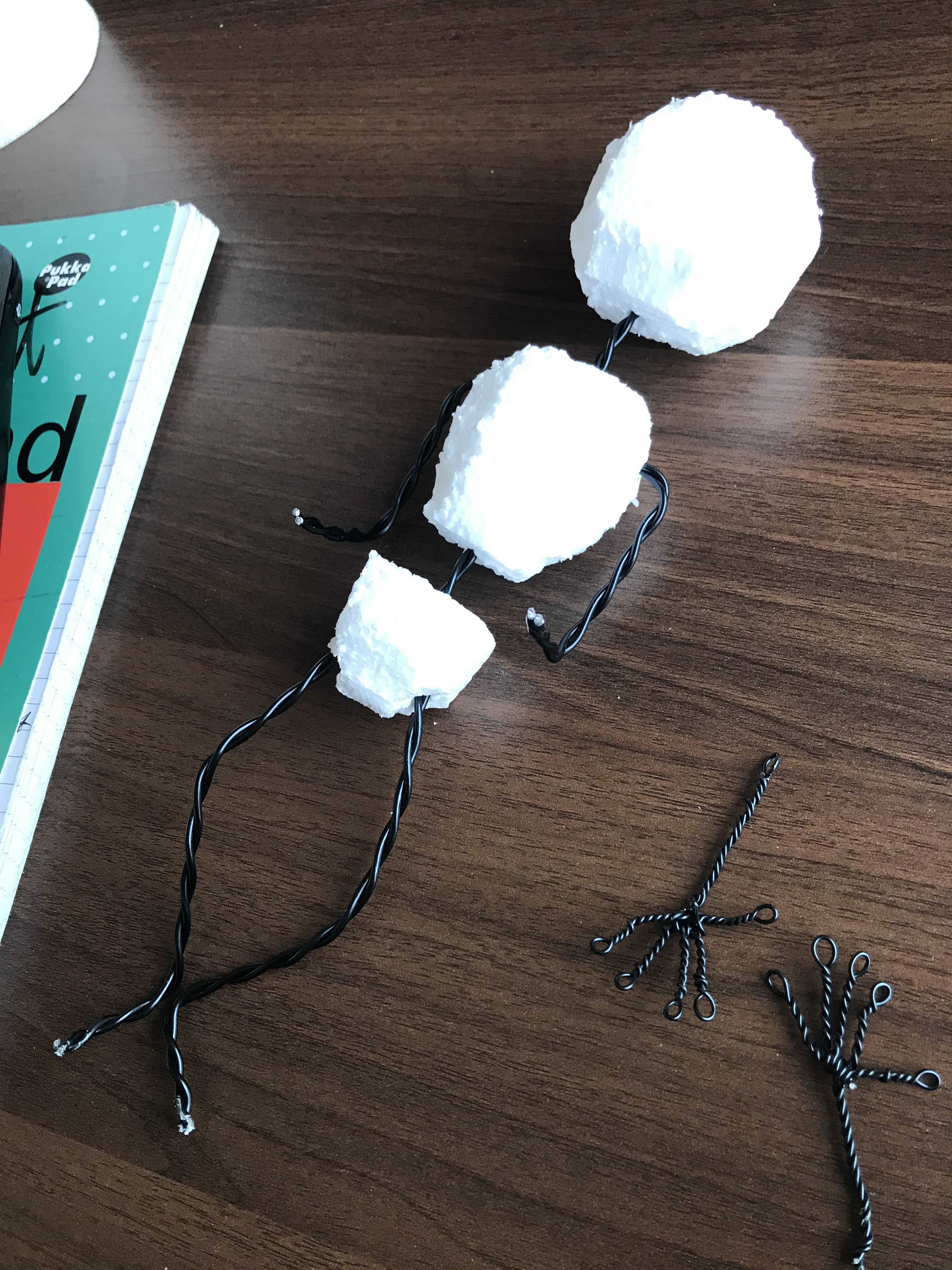 I have started to make some progress with making my main character’s puppet. I have made the main body out of polystyrene and have twisted wires for the skeleton and limbs of the puppet whilst attaching it to the body with the plastic cases of biro pens and also using them for the “bones” of the puppet.