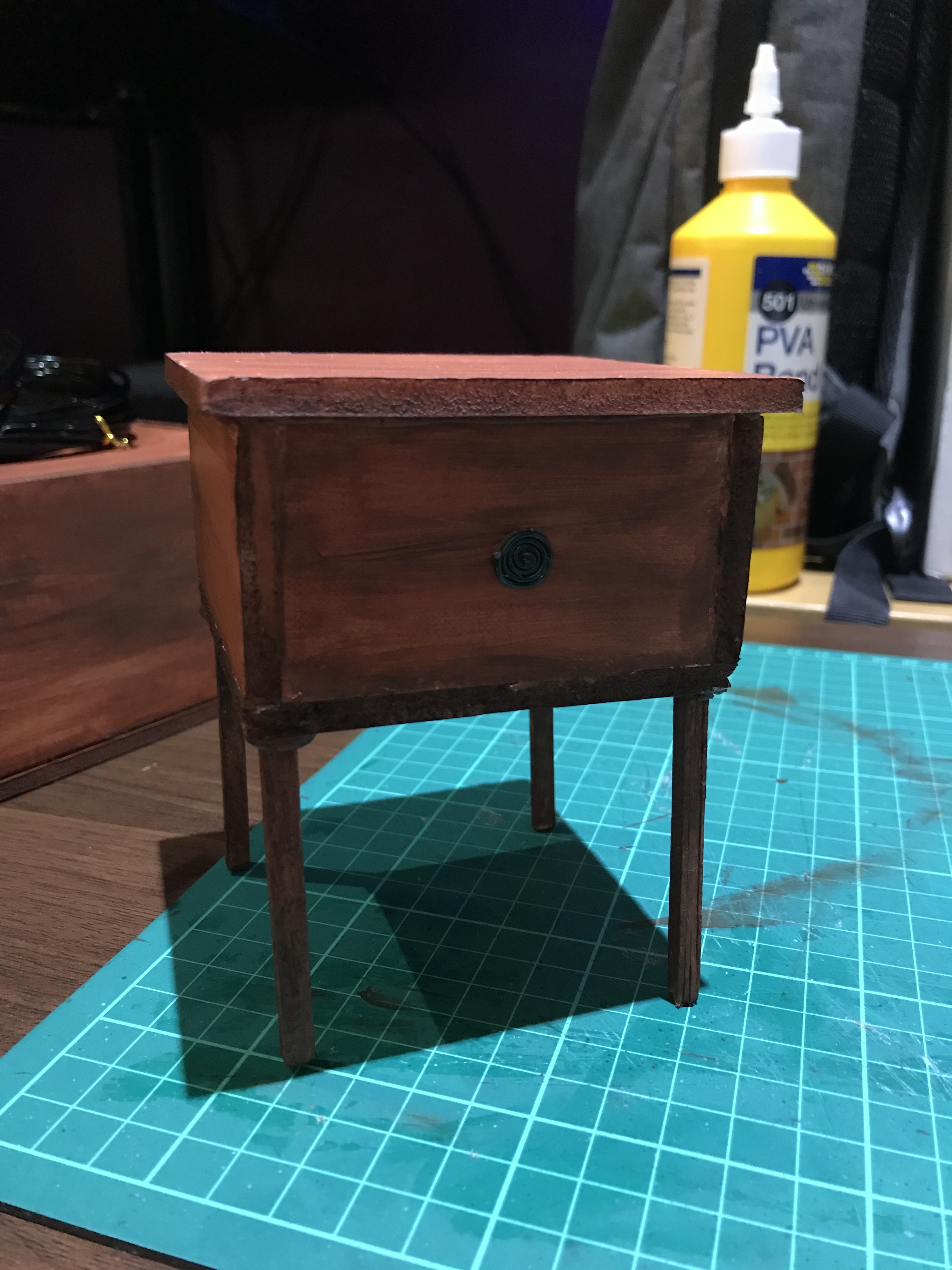 Here is the furniture for my film. Most of this is to mainly fill up the space in the bedroom and to make it look more like a room too. I used foam boards to make all of the furniture and also used glued together coffee stirrer sticks for the legs of the furniture like the bedside table and the draws. I also used the coffee sticks for the bottom of the bed to show the framing as there will be a scene in the film where my character is searching for something under the bed. For the main part of the bed, I have used cardboard.